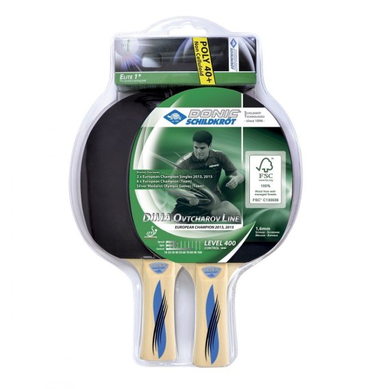 Zestaw dwóch rakietek do tenisa stołowego DONIC Fetzner 400 FSC i trzech piłek 1 * Elite Poly 40+.