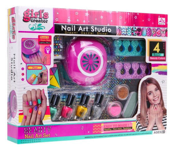 - suszarka do paznokci, - 4 lakiery do paznokci (w tym 1 lakier brokatowy) - dwa pojemniczki z brokatem, - pilnik do paznokci, - bufor do paznokci, - dwa separatory do palców, - klejnociki na paznokcie. |