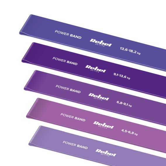 Zestaw gum do ćwiczeń lateksowy - Mini Band L, 2.3-18.2 kg, 5 gum, fioletowy, REBEL ACTIVE