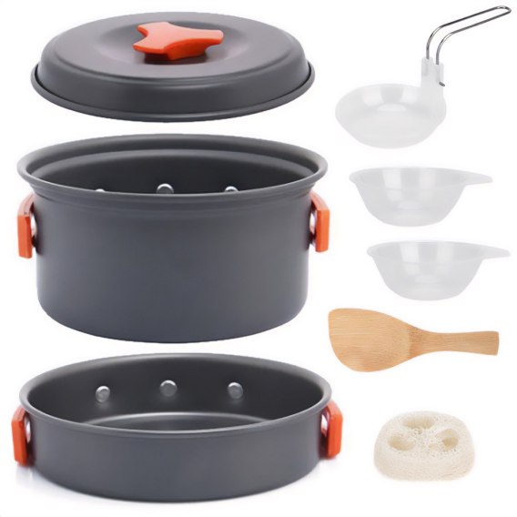 Zawartość zestawu: Garnek z pokrywką, patelnia, 2 miseczki, chochelka, czyścik, bambusowa łyżka, siatkowany worek